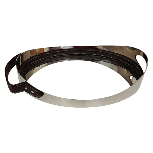 Bandeja em Aço Inoxidável Prata com Detalhe Couro Marrom