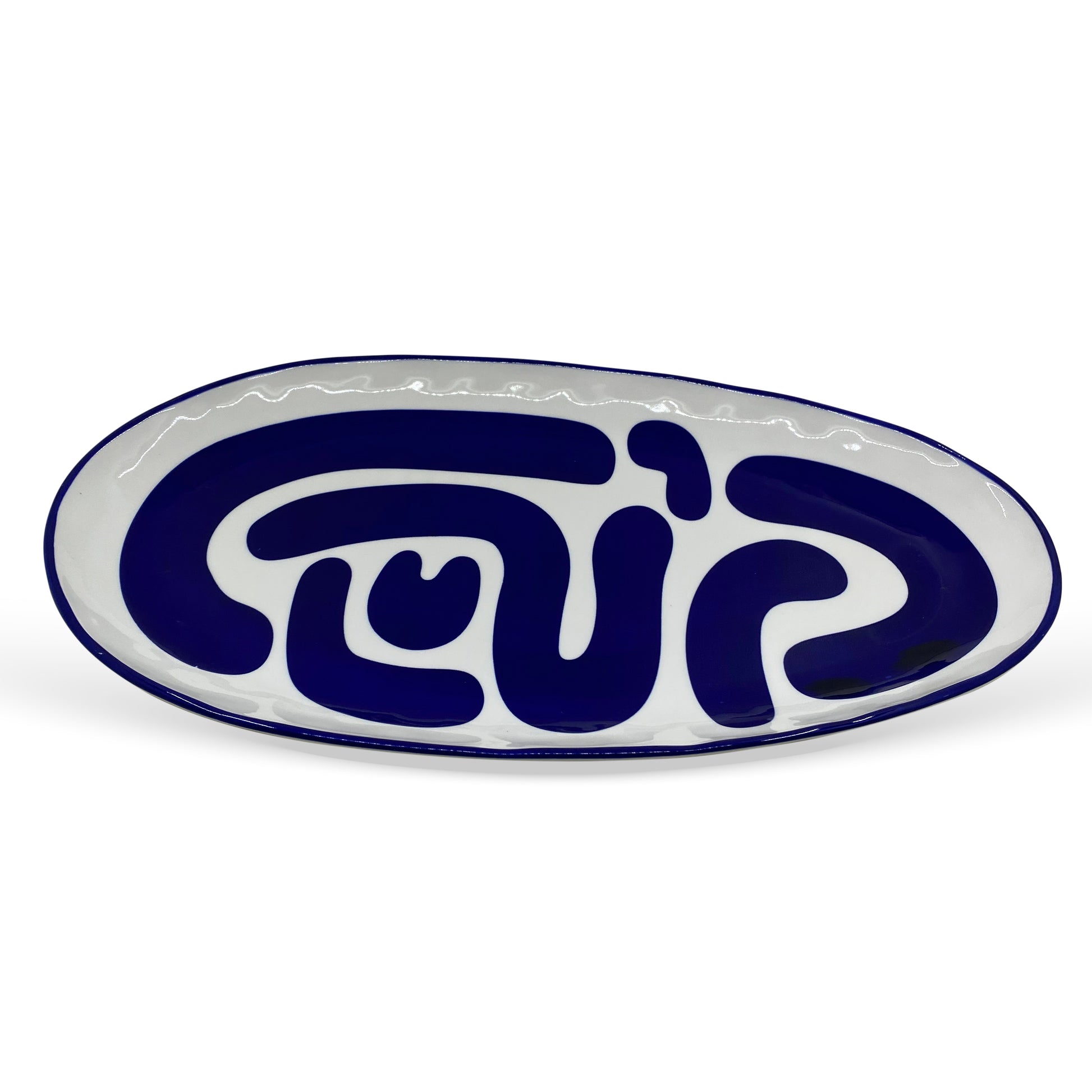 Bandeja oval em cerâmica com base branca e desenho geométrico em azul intenso. Uma peça moderna para servir ou decorar com estilo.