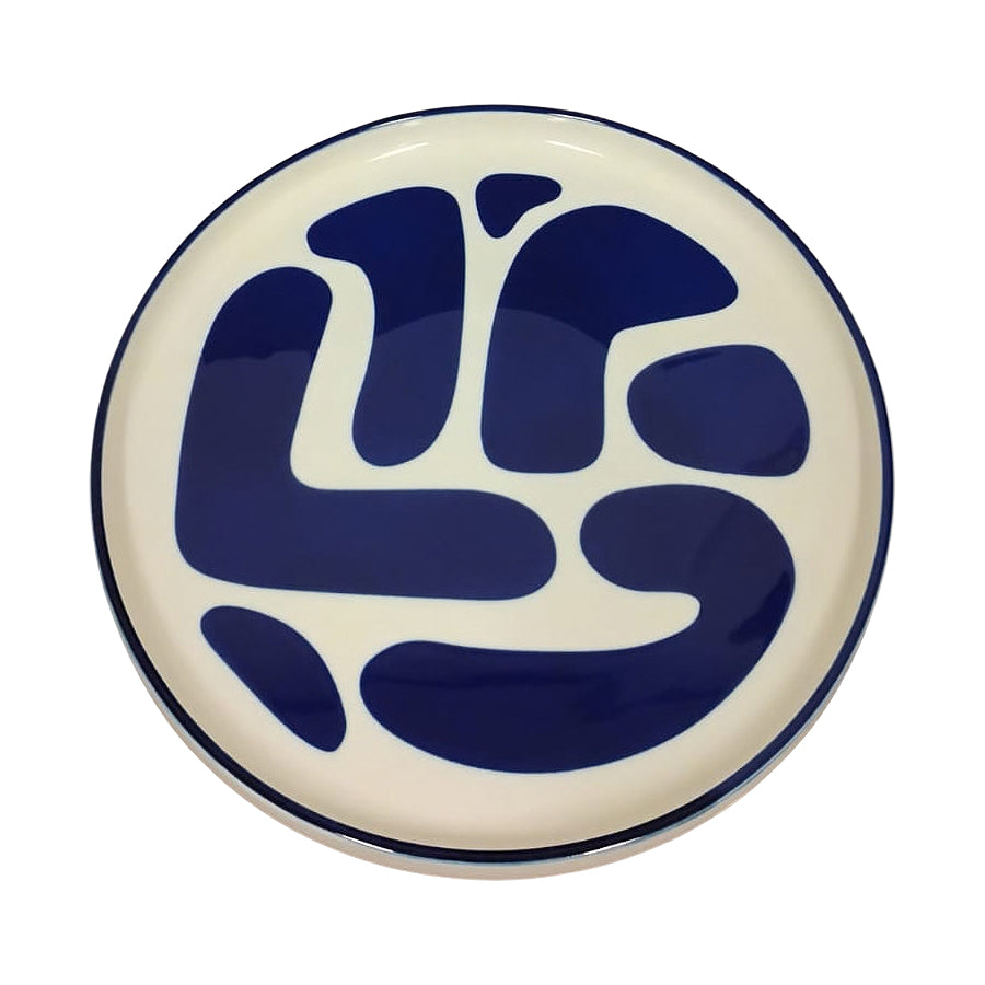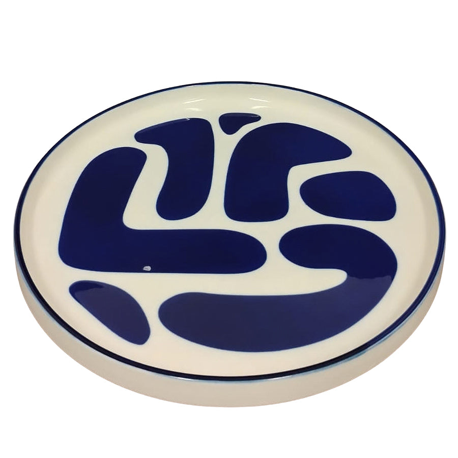 Travessa redonda em porcelana branca com estampa orgânica em azul profundo, de design contemporâneo e marcante. O contraste elegante e o acabamento esmaltado valorizam a peça, perfeita para servir com estilo ou compor a mesa com personalidade e sofisticação Medidas aproximadas: D28 x A3 cm
