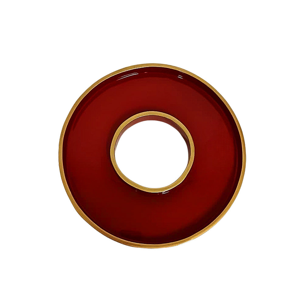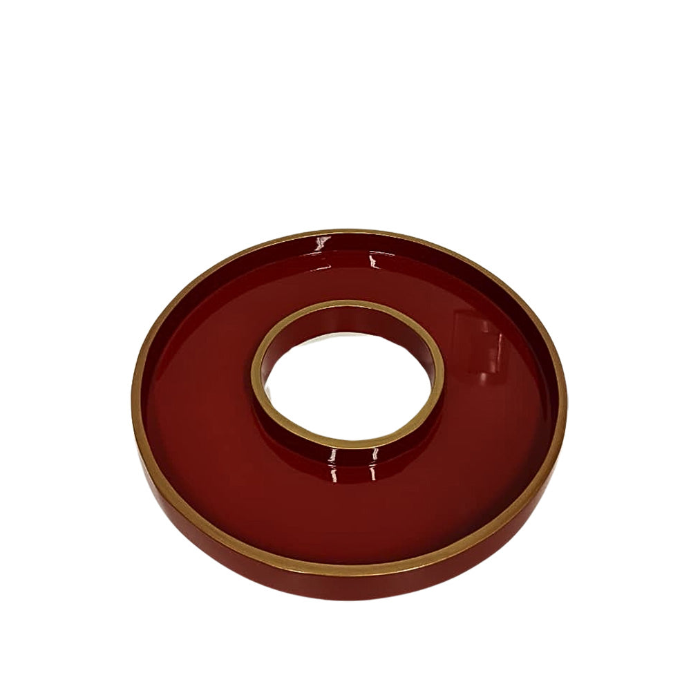 Bandeja Guirlanda na cor vermelho queimado, em madeira laqueada com elegante filete dourado e acabamento Highgloss. Seu design circular com recorte central traz um toque moderno e sofisticado à decoração — perfeita para velas, arranjos ou composições sobre mesas e aparadores.