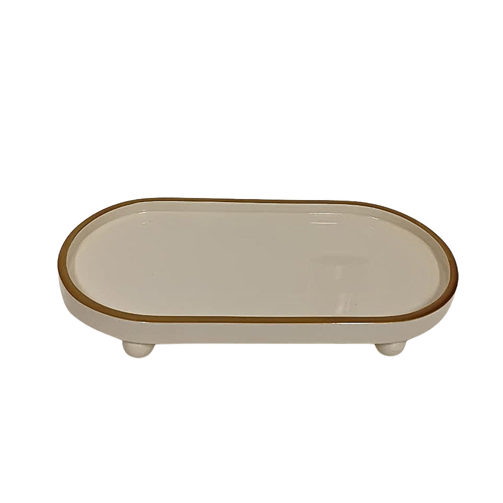 Bandeja Oval Pequena em madeira e MDF, na cor Mascarpone, com elegante filete dourado e acabamento Highgloss. Sofisticada e versátil, é perfeita para compor aparadores, lavabos ou mesas laterais, destacando pequenos objetos decorativos ou aromatizadores.