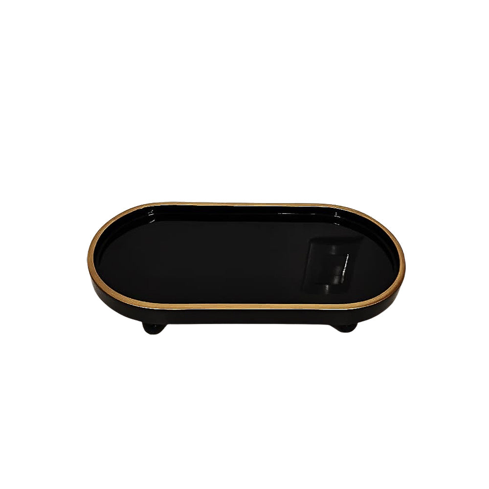 Bandeja Oval Pequena em madeira e MDF, na cor preta, com elegante filete dourado e acabamento Highgloss. Sofisticada e versátil, é perfeita para compor aparadores, lavabos ou mesas laterais, destacando pequenos objetos decorativos ou aromatizadores.