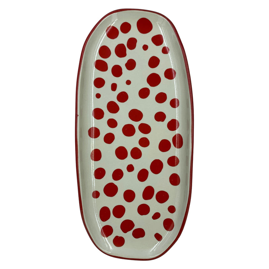 Travessa oval em porcelana natural, com acabamento em bolas e friso no tom vermelho. Um detalhe elegante e versátil para servir à mesa ou decorar com charme, unindo delicadeza e personalidade em cada detalhe.