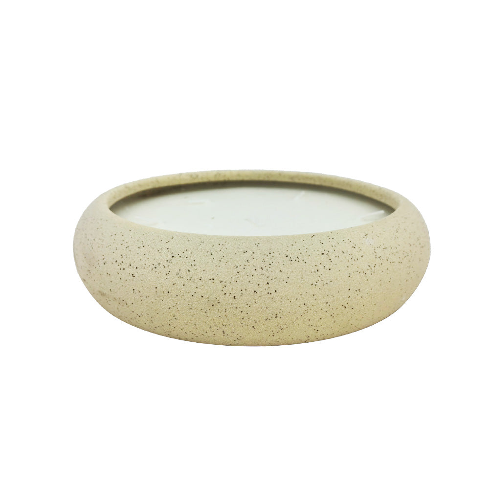Vela aromatizada com fragrância de baunilha em recipiente de cerâmica bege com acabamento fosco e design minimalista. Proporciona um ambiente acolhedor e perfumado.